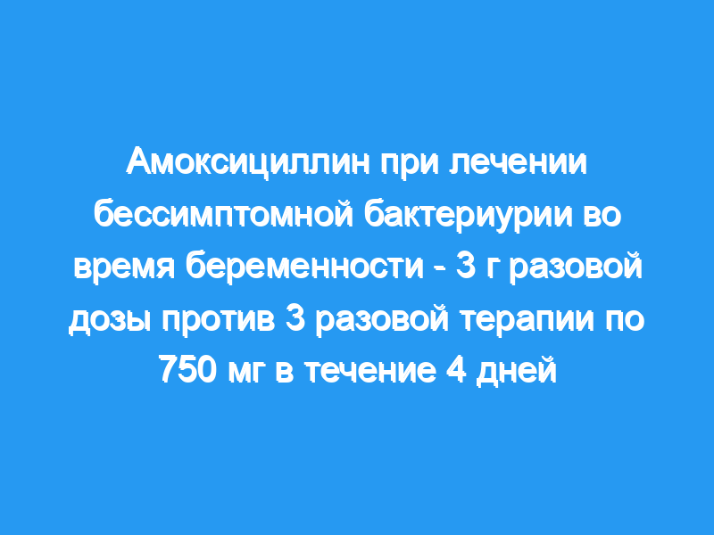 Побочные эффекты возникали у в группе А — 4%, а в группе В — 13%. Наши результаты показывают, что для лечения бессимптомной бактериурии во время беременности однократная доза 3 г амоксициллина столь же эффективна и приемлема, как и 4-дневный курс, с преимуществом более низкой общей дозы, меньшими затратами и лучшей комплаентностью.