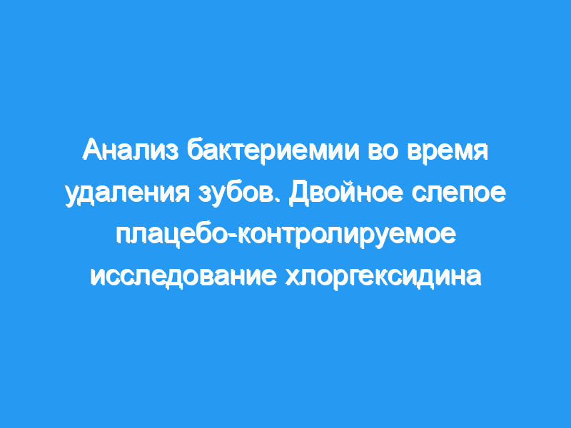 Определить частоту и характер бактериемии при удалении одного зуба у взрослых. Двойное слепое рандомизированное плацебо-контролируемое исследование с участием 70 пациентов, в котором состояние стоматологических заболеваний сравнивалось с частотой и характером аэробных и анаэробных бактериемий после удаления одного зуба и антибактериальным эффектом полосканий хлоргексидина гидрохлоридом. Многочисленные показатели стоматологических заболеваний были оценены и зарегистрированы перед хирургической процедурой. Контролировались сроки полоскания рта, этапы хирургической процедуры и два анализа крови.