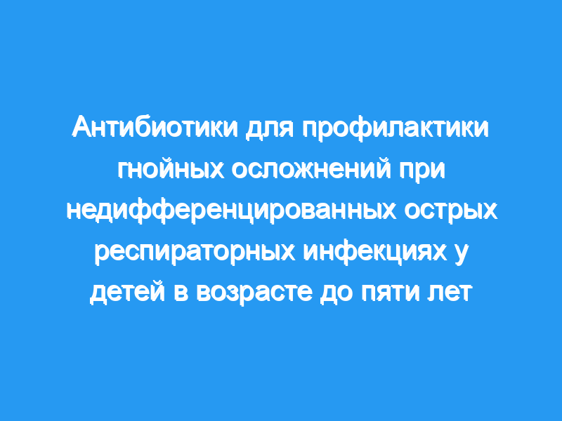 Мы выявили четыре испытания с участием 1314 детей. В трех исследованиях изучалось применение амоксициллина/клавулановой кислоты для профилактики отита, а в одном — ампициллина для профилактики пневмонии.Применение амоксициллина/клавулановой кислоты по сравнению с плацебо для профилактики отита показало соотношение рисков (ОР) 0,70 (95% доверительный интервал (ДИ) 0,45-1,11, три исследования, 414 отобранных детей, доказательства среднего качества). Методы генерации случайных последовательностей и сокрытия распределения не были четко указаны в двух испытаниях. В трех испытаниях нельзя было исключить предвзятость в отношении производительности, обнаружения и отчетности.Ампициллин по сравнению с поддерживающей терапией (продолжение грудного вскармливания, промывание носа и парацетамол для контроля температуры) для предотвращения пневмонии показал ОР 1,05 (95% ДИ 0,74-1,49, одно исследование, 889 отобранных детей, доказательства среднего качества). Испытание не было слепым. Методы генерации случайных последовательностей и сокрытия распределения четко не были указаны, поэтому нельзя было исключить возможность предвзятости в отчетности.Последствия причинения вреда не поддавались анализу, поскольку они выражались только в процентах.Не было обнаружено исследований, оценивающих мастоидит, ангину, абсцесс, менингит, госпитализацию или смерть. Выводы авторов: Качество имеющихся в настоящее время фактических данных не обеспечивает убедительной поддержки применения антибиотиков в качестве средства снижения риска развития отита или пневмонии у детей в возрасте до пяти лет с недифференцированным ОРЗ. Необходимы дальнейшие высококачественные исследования, чтобы предоставить более точные доказательства эффективности антибиотиков в этой популяции.