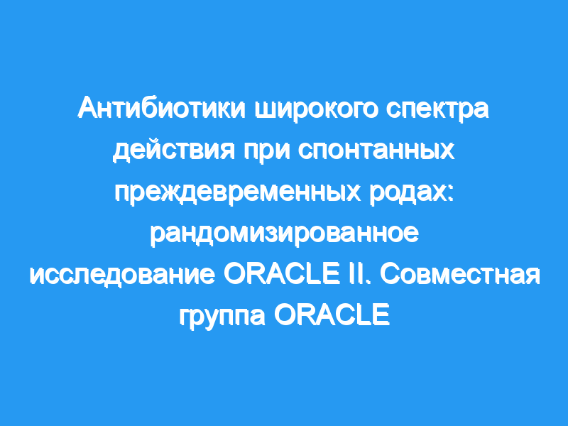6295 женщинам при спонтанных преждевременных родах с неповрежденными плодными оболочками и без признаков клинической инфекции были случайным образом назначены 250 мг эритромицина (n=1611), 325 мг ко-амоксиклава (250 мг амоксициллина и 125 мг клавулановой кислоты, n=1550), оба (n=1565), или плацебо (n=1569) четыре раза в день в течение 10 дней или до родов, в зависимости от того, что произошло раньше. Первичным показателем исхода была совокупность неонатальной смерти, хронического заболевания легких или серьезных нарушений мозгового кровообращения при ультразвуковом исследовании перед выпиской из больницы. Анализ проводился с намерением лечить. Результаты: Ни один из исследуемых антибиотиков не был связан с более низкой частотой комбинированного первичного исхода, чем плацебо (эритромицин 90 [5,6%], ко-амоксиклав 76 [5,0%], оба антибиотика 91 [5,9%], против плацебо 78 [5,0%]). Однако назначение антибиотиков было связано с более низкой частотой материнской инфекции. Интерпретация: Это исследование предоставляет доказательства того, что антибиотики не следует регулярно назначать женщинам при спонтанных преждевременных родах без признаков клинической инфекции.