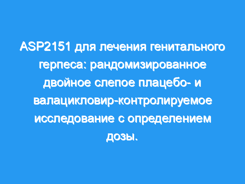 В этом рандомизированном исследовании оценивалась безопасность и эффективность ASP2151 для эпизодической терапии рецидивирующего генитального герпеса. Участники самостоятельно принимали АСП2151 (100, 200 или 400 мг ежедневно в течение 3 дней), АСП2151 (1200 мг в виде разовой дозы), плацебо в течение 3 дней или валацикловир (500 мг два раза в день в течение 3 дней). Первичная конечная точка эффективности, время до заживления повреждения, исключая прерванные повреждения, была проанализирована с использованием модели пропорциональных рисков. Статистическая значимость была определена с помощью P = 0,01.