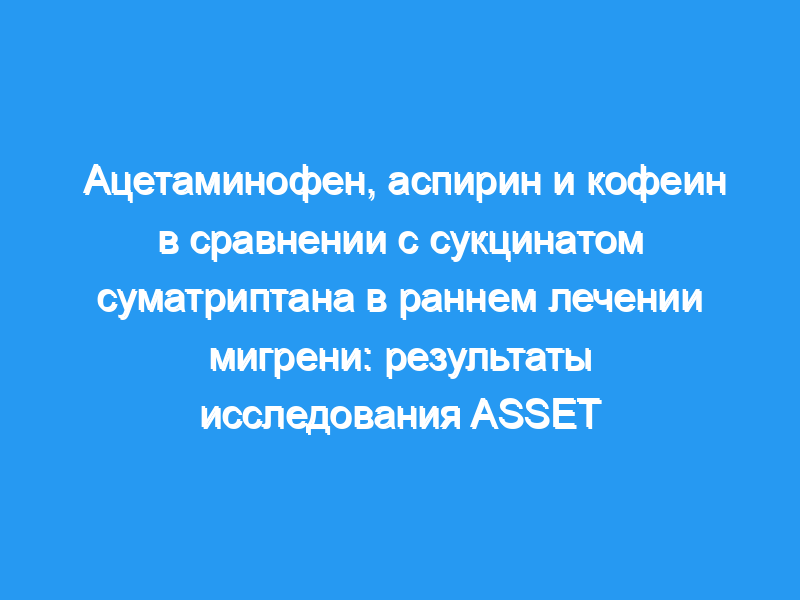 Комбинация ацетаминофена, аспирина и кофеина была значительно более эффективной (P >, 0,05), чем суматриптан, в раннем лечении мигрени, о чем свидетельствует превосходство в суммарной разнице в интенсивности боли, облегчении боли, разнице в интенсивности боли, реакции, устойчивой реакции, облегчении мигрени. сопутствующие симптомы, использование спасательных лекарств, облегчение инвалидности и глобальные оценки эффективности. Для подтверждения этих результатов необходимо дополнительное, более масштабное клиническое исследование.
