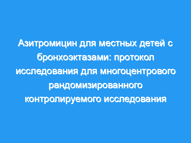 Если это исследование продемонстрирует, что азитромицин эффективен в снижении числа легочных обострений, это даст столь необходимое обоснование для использования антибиотиков длительного действия при лечении бронхоэктазов у детей коренных народов. Регистрация испытания: Австралийско-Новозеландский реестр клинических испытаний: ACTRN12610000383066.