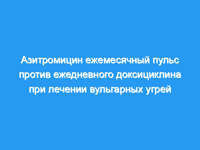 Для оценки чтобы оценить роль ежемесячной дозы азитромицина и сравнить ее с ежедневной дозой доксициклина, мы провели это рандомизированное сравнительное исследование.Шестьдесят пациентов с акне средней и тяжелой степени были случайным образом распределены на две группы лечения, A и B. Пациенты в группе A получали 100 мг доксициклина ежедневно в дополнение к местному 0,05% крему третиноина, в то время как пациенты в группе B получали 500 мг азитромицина один раз в день в течение четырех дней в день. месяц вместе с 0,05% местным третиноином в общей сложности в течение 12 недель.