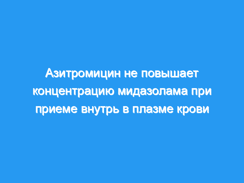 Лечение азитромицином увеличило среднее (диапазон) время пика концентрации мидазолама с 1,0 (0,5-2) ч до 1,25 (0,5-5) ч и снижение концентрации мидазолама в плазме крови в течение первых 3 часов после приема мидазолама (p <, 0,05). Средняя +/- средняя пиковая концентрация мидазолама была снижена с 86 +/- 17 нг мл-1 до 57 +/- 9 нг мл-1 (p <, 0,05). Азитромицин не увеличивал общую площадь под кривой концентрация-время и не изменял период полувыведения мидазола.