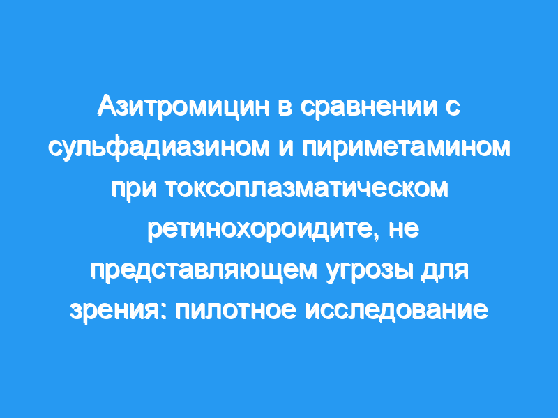 Целью этого пилотного исследования является сравнение эффективности и переносимости только азитромицина в отличие от стандартного лечения сульфадиазином и пириметамином при активном, не угрожающем зрению токсоплазматическом ретинохороидите. Материал/методы: Мы провели проспективное рандомизированное институциональное клиническое исследование, в котором сравнивали азитромицин с сульфадиазином и пириметамином при активном, не угрожающем зрению токсоплазматическом ретинохороидите. Девятнадцать из 75 пациентов соответствовали критериям включения и были рандомизированы на 2 схемы лечения. Девять пациентов получали сульфадиазин и пириметамин, а 10 пациентов — азитромицин в дозе 500 мг в сутки. Основными оцененными показателями результатов были время до заострения границ поражения, время до рубцевания поражения, время до бездействия заболевания и переносимость лечения.