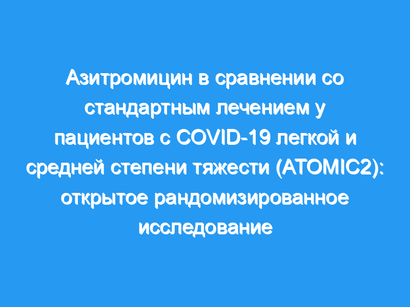 Это проспективное открытое рандомизированное клиническое исследование было проведено в 19 больницах Великобритании. В исследование были включены взрослые в возрасте не менее 18 лет, обратившиеся в больницы с клинически диагностированной, высоковероятной или подтвержденной инфекцией COVID-19 с симптомами менее 14 дней, которые были признаны подходящими для первоначального амбулаторного лечения. Пациенты были рандомизированы (1:1) на азитромицин (500 мг один раз в день перорально в течение 14 дней) плюс стандартное лечение или только стандартное лечение. Первичным исходом была смерть или госпитализация по любой причине в течение 28 дней с момента рандомизации. Первичные результаты и безопасность оценивались в соответствии с принципом намерения лечить. Это испытание зарегистрировано по адресу ClinicalTrials.gov (NCT04381962) и набор закрыт. Результаты: с 3 июня 2020 года по 29 января 2021 года было зарегистрировано 298 участников. Три участника отозвали согласие и потребовали удаления всех данных, а еще три участника отозвали согласие после рандомизации, таким образом, первичный результат был оценен у 292 участников (145 в группе азитромицина и 147 в группе стандартного лечения). Средний возраст участников составил 45·9 лет (SD 14·9). 15 (10%) участники в группе азитромицина и 17 (12%) в группе стандартного лечения были госпитализированы или умерли во время исследования (скорректированный OR 0·91 [95% ДИ 0·43-1·92], p=0·80). О каких-либо серьезных побочных явлениях не сообщалось. Интерпретация: У пациентов с COVID-19 легкой и средней степени тяжести, которых лечили без госпитализации, добавление азитромицина к стандартному лечению не снижало риск последующей госпитализации или смерти. Наши результаты не подтверждают применение азитромицина у пациентов с COVID-19 легкой и средней степени тяжести. Финансирование: Национальный институт медицинских исследований, Оксфордский центр биомедицинских исследований, Оксфордский университет и Pfizer.