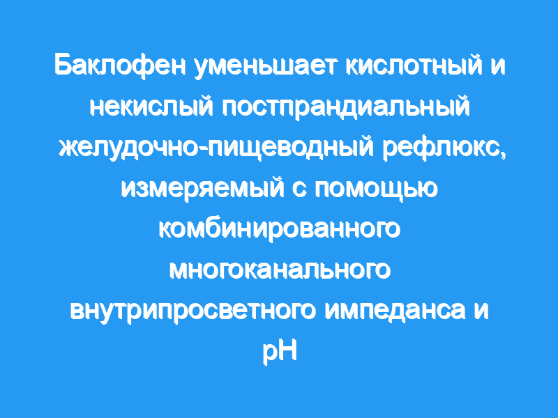 Омепразол контролирует кислотный, но не некислотный рефлюкс. Агонист ГАМК-В баклофен уменьшает кислотный рефлюкс за счет ингибирования кратковременного расслабления нижнего пищеводного сфинктера (TLESRs) и должен аналогичным образом уменьшать некислотный рефлюкс. Используя комбинированный многоканальный внутрипросветной импеданс и pH (MII/pH), мы сравнили кислотный и некислотный рефлюкс после плацебо и баклофена.