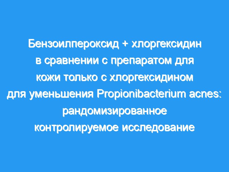 В общей сложности 22 участника мужского пола были рандомизированы. Все участники были колонизированы P. acnes на исходных мазках. Мы обнаружили полное ингибирование P. acnes через 14 дней на 80% участков, обработанных перекисью бензоила + хлоргексидин /спирт, по сравнению с 86% ингибированием на участках плеча, обработанных только хлоргексидином.