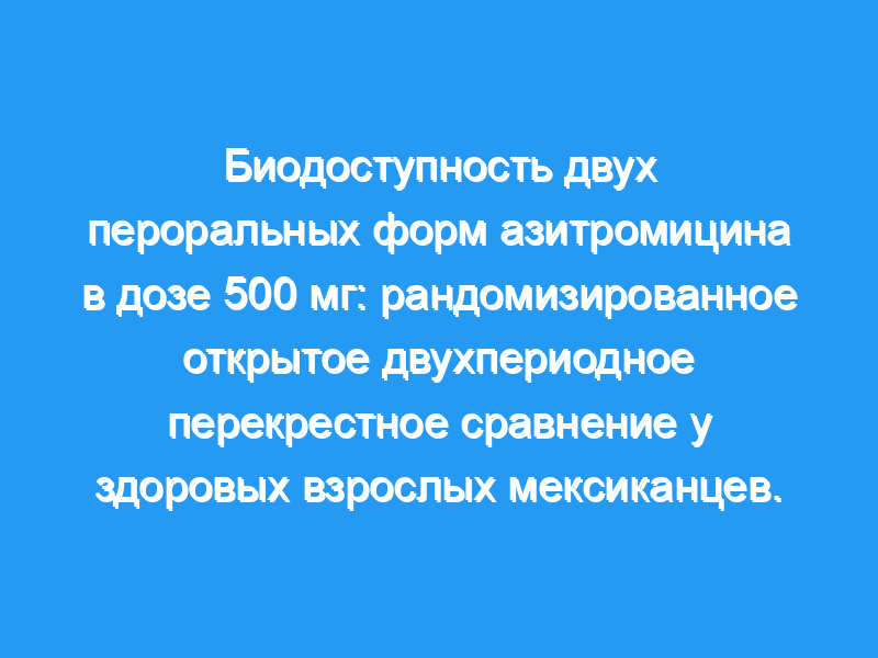 Это перекрестное рандомизированное открытое исследование 2 × 2 было проведено на кафедре фармакологии и токсикологии Автономного университета Нуэво-Леон, Монтеррей, Мексика. Приемлемыми испытуемыми были здоровые добровольцы любого пола со следующими характеристиками: возраст >, or = от 19 до 25 лет, вес от 54 до 77 кг и рост от 159 до 177 см. Субъекты были случайным образом распределены на прием Макрозита с последующим приемом азитроцина или наоборот, с 3-недельным периодом вымывания между дозами. После 12-часового (ночного) голодания субъекты получали однократную дозу каждого препарата в дозе 500 мг. Для анализа фармакокинетических свойств, включая C(max), AUC (0-t) и AUC (0-бесконечность), образцы крови отбирали при 0.5, 1, 1.5, 2, 2.5, 3, 4, 6, 12, 24, 48, 72, 96, и 120 через несколько часов после приема препарата. Препараты считались биоэквивалентными, если преобразованные в логарифм (ln) соотношения C(max) и AUC находились в пределах заданного диапазона эквивалентности от 80% до 125% и если P <, or = 0,05 для 90% CIs. Переносимость оценивалась путем мониторинга и опроса испытуемых на предмет потенциального наличия нежелательных явлений (НЯ). В исследовании приняли участие двадцать восемь человек, 27 завершили его (14 мужчин, 13 женщин, средний возраст 21,7 года). Четырнадцать испытуемых сначала получили тестовую формулировку. Никакого эффекта периода или последовательности не наблюдалось. 90% CIs для соответствующих соотношений C(max), AUC(0-t) и AUC(0-бесконечность) составили 80,67 — 107,21, 91,39 — 107,59 и 90,61-106,19 (все, P <, 0,05). Аналогичные результаты были получены для данных без логарифмического преобразования. На протяжении всего исследования не было обнаружено ни одного AES.