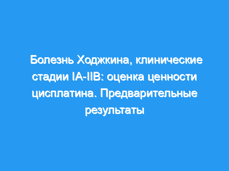Цисплатин обладает высокой эффективностью при многочисленных солидных опухолях и был оценен на клинических стадиях болезни Ходжкина (CS) I/II. Шестьдесят пять пациентов (43 мужчины, 22 женщины, средний возраст 25 лет, из них 12 пациентов младше 16 лет: CS IA-IIA 41, IB 5, IIB 19) были случайным образом распределены в одну из следующих групп (протокол PAF87): 3 АБВД (доксорубицин, блеомицин, винбластин, дакарбазин с метилпреднизолоном) циклов (рука ABVD) или 3 цикла ABVD плюс цисплатин (рука ABVD-Plt) с последующей лучевой терапией (RT), расширенное поле (40 Гр), затем в руку ABVD вводили RT с коротким парааортальным полем, включающим селезенку (30 Гр), расширенное поле (30 Гр) без ломбоспленового порта. профилактика.