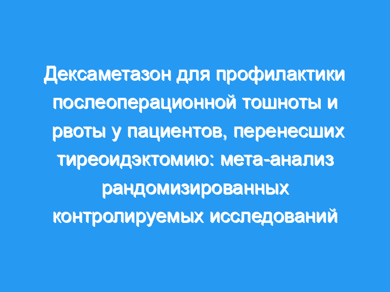 Мы провели систематический обзор рандомизированных контролируемых исследований (РКИ), в которых сравнивалось предоперационное однократное введение дексаметазона и отсутствие дексаметазона у пациентов, перенесших тиреоидэктомию. Первичным исходом было возникновение PONV в течение 24 часов, а вторичными исходами были боль, использование анальгетиков и осложнения, связанные со стероидами.