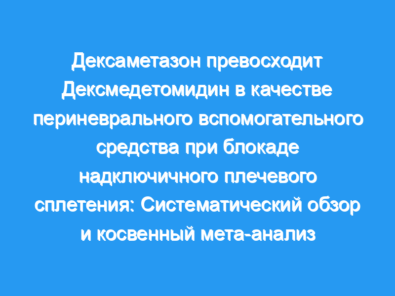 И дексаметазон, и дексмедетомидин являются эффективными периневральными вспомогательными средствами для блокады периферических нервов (PNB), которые продлевают продолжительность блокады. Однако каждый из них связан с побочными эффектами. Из-за недостатка прямых сравнений этих вспомогательных средств вопрос о том, какое вспомогательное средство лучше всего смешивать с местными анестетиками (LA) для PNB, остается без ответа. Этот мета-анализ направлен на информирование о текущей практике и будущих исследованиях путем определения превосходящего вспомогательного средства путем сравнения дексаметазона и дексмедетомидина.