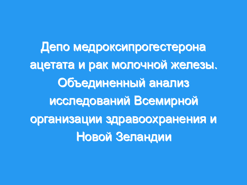 Новая Зеландия (вся страна), Таиланд (три центра), Мексика (один центр) и Кения (один центр). Участники: в общей сложности 1768 женщин с раком молочной железы и 13 905 контрольных, большинство из которых были моложе 55 лет. Основной показатель результата: Относительный риск (ОР) рака молочной железы у женщин, которые использовали DMPA.
