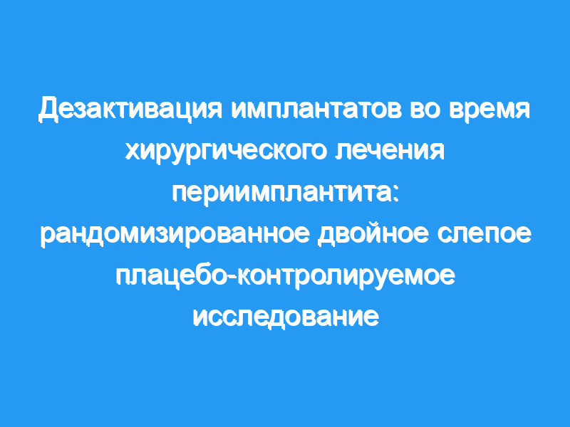 Целью этого рандомизированного двойного слепого плацебо-контролируемого исследования было изучение влияния обеззараживания поверхности имплантата хлоргексидином (CHX)/цетилпиридиния хлоридом (CPC) на микробиологические и клинические параметры. Материал и методы: Тридцати пациентам (79 имплантатов) с периимплантитами было проведено резективное хирургическое лечение, состоящее из апикального смещения лоскута, изменения контуров кости, обработки поверхности и обеззараживания. Пациенты были случайным образом распределены для обеззараживания 0,12% CHX + 0,05% CPC (тест-группа) или плацебо-раствором (без CHX/CPC, плацебо-группа). Микробиологические параметры регистрировали во время операции, клинические и рентгенологические параметры регистрировали до (до) лечения (исходные данные), а также через 3, 6 и 12 месяцев после лечения.