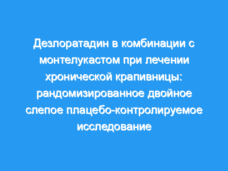 Цель этого исследования — определить, является ли монтелукаст, антагонист рецепторов LTD4, в сочетании с дезлоратадином более эффективным, чем один дезлоратадин, при лечении хронической крапивницы. Материалы: Рандомизированное двойное слепое плацебо-контролируемое исследование было проведено на 81 пациенте с диагнозом КР. За 1-недельным периодом однократного слепого приема плацебо (базовый уровень) последовал 6-недельный период активного двойного слепого лечения. Пациенты были рандомизированы для получения следующего лечения один раз в день: (а) пероральный дезлоратадин (5 мг) плюс плацебо, (б) дезлоратадин (5 мг) плюс монтелукаст (10 мг), (в) только пероральное плацебо. Исследование закончилось после еще одного 1-недельного однократного слепого периода вымывания плацебо.