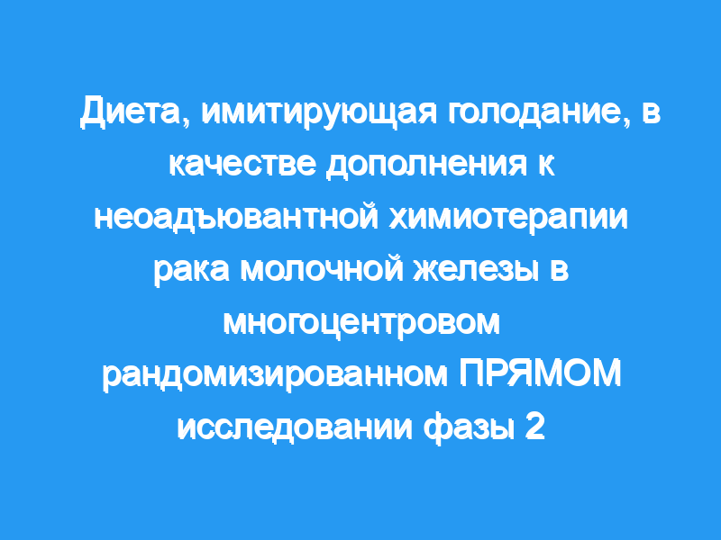 Мы рандомизировали 131 пациента с HER2-негативным раком молочной железы II/III стадии, без диабета и ИМТ более 18 кг/м2, для получения либо диета, имитирующая голодание (FMD), или их обычная диета в течение 3 дней до и во время неоадъювантной химиотерапии.