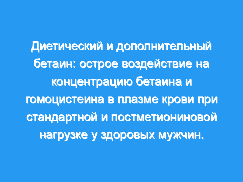 Диетический и дополнительный бетаин повышали концентрацию бетаина в плазме крови по сравнению с контролем (P <, 0,001) в стандартных условиях. Это не было связано с повышением концентрации диметилглицина в плазме крови, и в моче не было обнаружено значительного количества бетаина. Небольшое увеличение экскреции диметилглицина наблюдалось при введении бетаина или холина (Р = 0,011 и < 0,001). Небольшое снижение уровня гомоцистеина в плазме крови через 6 ч после приема внутрь в стандартных условиях (P <, or = 0,05) было обнаружено после приема пищи с высоким содержанием бетаина и после приема пищи с высоким содержанием бетаина и холина. Прием бетаина и холина с пищей и добавок бетаина ослаблял повышение уровня гомоцистеина в плазме крови как через 4, так и через 6 ч после нагрузки метионином (P <, or = 0,001).