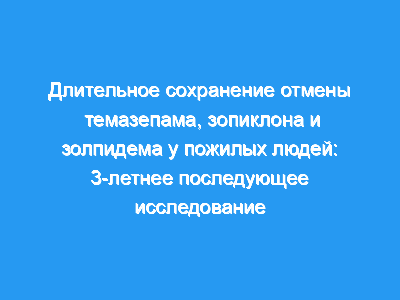 Исследований стойкости отмены бензодиазепиновых агонистов (BZDA) у пожилых амбулаторных пациентов мало, и до сих пор опубликовано мало исследований о длительной стойкости в течение многих лет. Описать сохранение отмены темазепама, золпидема и зопиклона (BZDA) у пожилых амбулаторных пациентов через 3 года после начала отмены, а также любые изменения в использовании других лекарств. 92 амбулаторных пациента (≥55 лет) с первичной бессонницей, длительным применением BZDA в качестве снотворного (средняя продолжительность применения BZDA 9,9 ± 6,2 года) и желанием отказаться от BZDA каждый из них получал либо мелатонин, либо плацебо каждую ночь в течение одного месяца. В течение этого периода предполагалось, что БЗДЫ будут постепенно отменены. Были предоставлены консультации по гигиене сна и психосоциальная поддержка. Три года спустя использование BZDA и других лекарств было определено путем опроса и подтверждено медицинскими записями.