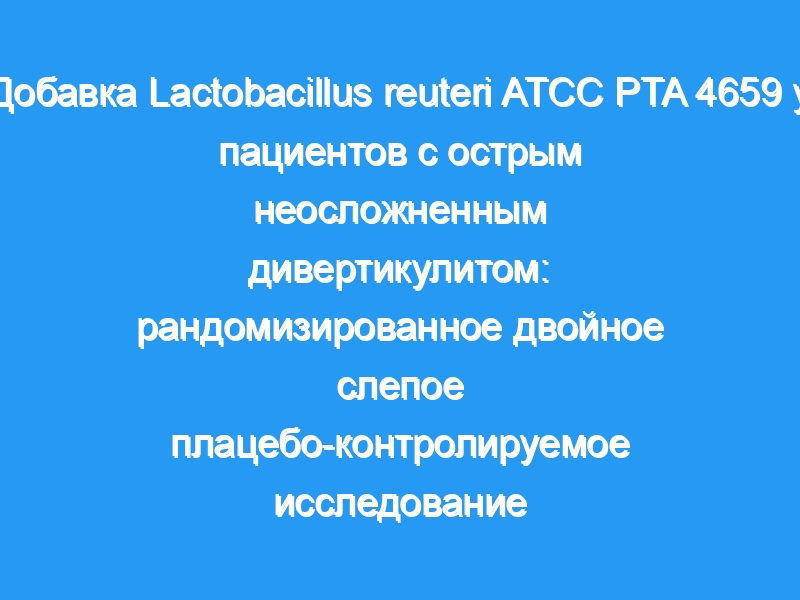 Острый неосложненный дивертикулит (AUD) — это воспаление дивертикула толстой кишки. Мы протестировали эффективность Lactobacillus reuteri 4659 (L. reuteri) при лечении AUD. Первичным результатом было уменьшение боли в животе и маркеров воспаления (C-RP). Вторичным результатом было сокращение часов госпитализации. Пациенты и методы: Было проведено двойное слепое плацебо-РКИ с участием 88 (34M/54F, средний возраст 61,9 ± 13,9) пациентов с диагнозом AUD. Группа А (44 пациента, 26F): ципрофлоксацин 400 мг/сут и метронидазол 500 мг/сут в течение 1 недели, плюс L. reuteri/сут в течение 10 дней. Группа В (44 пациента, 28F): та же антибактериальная терапия в течение 1 недели плюс плацебо/бид в течение 10 дней. Все пациенты заполняли ежедневную визуальную аналоговую шкалу (ВАШ) для оценки боли в животе.