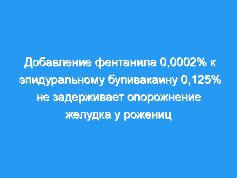 Наши результаты показывают, что эпидуральные инфузии для обезболивания родов с использованием 0,125% бупивакаина и 0,0002% фентанила не задерживают опорожнение желудка по сравнению с инфузиями только 0,125% бупивакаина.