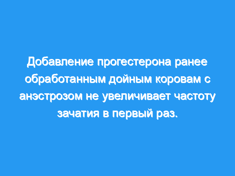 Частота зачатия при первом обращении в контрольной и лечебной группах не отличалась (35,0% против 36,7% соответственно, Р = 0,41). Кроме того, не было никакой разницы в частоте зачатия между коровами, которым были вставлены устройства на 4 или 5 день (31,3% против 37,2% соответственно, Р = 0,45). В заключение следует отметить, что введение ранее обработанным дойным коровам АА интравагинального устройства, высвобождающего прогестерон, в течение 7 дней (начиная с 4 или 5 дней после осеменения) не привело к значительному улучшению частоты зачатия в первый раз.