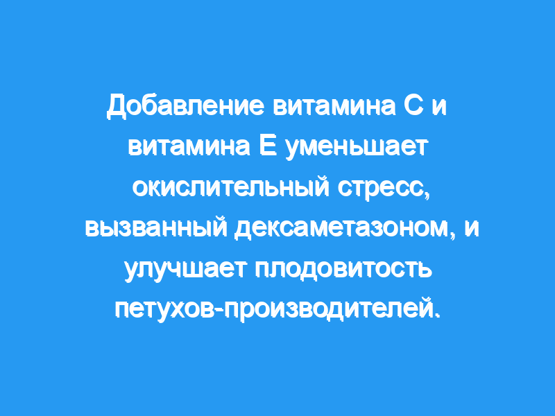 Это исследование было проведено для определения влияния дополнительного диетического витамина С (VC) и витамина Е (VE) на улучшение качества спермы и антиоксидантного статуса у петухов-производителей, которым вводили дексаметазон (DEX). 120 45-недельных петухов-производителей Lveyang с черной костью были разделены на 5 экспериментальных групп, включая отрицательную группу, положительную группу и три пробные группы, которым давали основной рацион с добавлением 300 мг/кг VC, 200 мг/кг VE или 300 мг/кг VC и 200 мг/кг VE (VC+VE). В возрасте 49 недель положительным контрольным и опытным группам подкожно вводили 3 раза через день ДЕКС в дозе 4 мг/кг массы тела, отрицательной контрольной группе вводили физиологический раствор.
