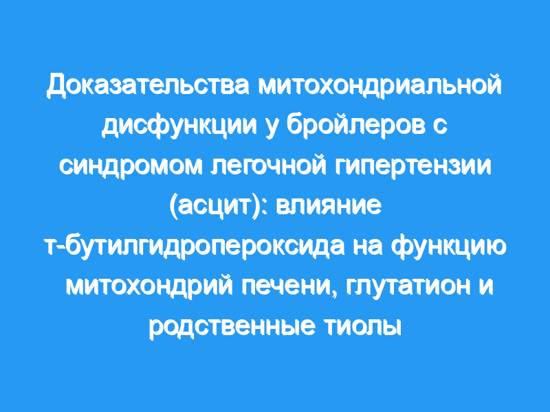 Целью данного исследования была оценка функции митохондрий и глутатиона (митохондриального антиоксиданта) в ответ на окислительный стресс в митохондриях in vitro, полученных от бройлеров с синдромом легочной гипертензии (ЛГ) и без него. Митохондрии печени контрольных и бройлеров PHS инкубировали с 0, 1 и 5 мм гидропероксидом третичного бутила (tBH). Показатели функции митохондрий [коэффициент контроля дыхания (RCR) и отношение аденозиндифосфата к кислороду (ADP:O)], а также уровни митохондриального и внемитохондриального восстановленного (GSH) и окисленного (GSSG) глутатиона, цистеина, цистина, глутамата и цистеинилглицина определяли после лечения tBH.