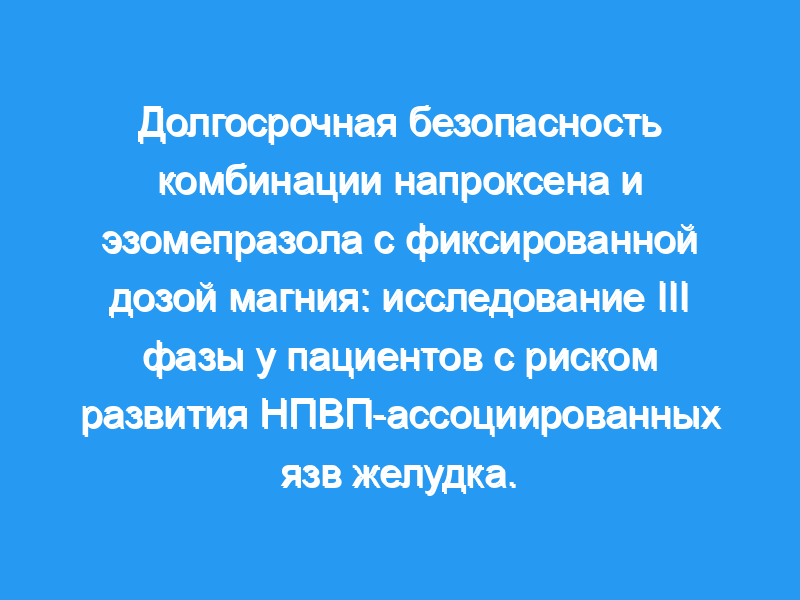 Оценить долгосрочную безопасность комбинации напроксена, покрытого кишечнорастворимой оболочкой, 500 мг и эзомепразола магния немедленного высвобождения в фиксированных дозах 20 мг (FDC) у пациентов с риском развития НПВП-ассоциированных язв верхних отделов желудочно-кишечного тракта (UGI). План и методы исследования: В этом открытом многоцентровом исследовании III фазы, отрицательные к Helicobacter pylori пациенты в возрасте ≥ 50 лет или 18-49 лет с неосложненной язвой в анамнезе в течение последних 5 лет, у которых был остеоартрит, ревматоидный артрит или другое заболевание, требующее ежедневных НПВП в течение ≥12 месяцев, получали напроксен /эзомепразол два раза в день в течение 12 месяцев. Регистрация клинического испытания: NCT00527904. Основные показатели результатов: Нежелательные явления (НЯ), показатели жизнедеятельности, физикальный осмотр и лабораторные анализы. Анализ подгрупп включал возраст и использование низких доз аспирина (LDA). Были проанализированы предопределенные НПВП-ассоциированные УГИ и сердечно-сосудистые заболевания.