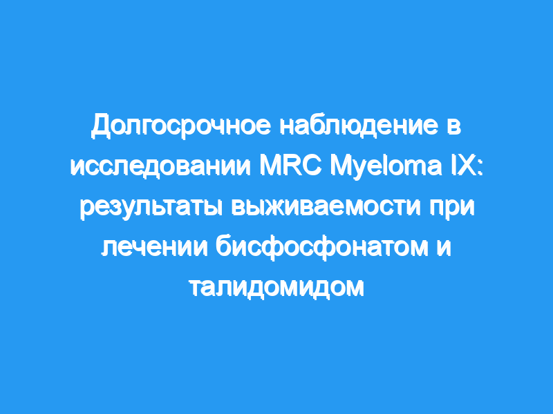 Совет по медицинским исследованиям (MRC) «Миелома IX» был испытанием III фазы, в котором оценивалась терапия на основе бисфосфонатов и талидомида при впервые диагностированной множественной миеломе. Результаты были сообщены ранее после медианы наблюдения в 3,7 года (номер текущего контролируемого исследования: ISRCTN68454111). Результаты выживаемости были повторно проанализированы после длительного наблюдения (медиана 5,9 лет). Экспериментальный план: При первой рандомизации пациентам (N = 1970) были назначены бисфосфонаты (клодроновая кислота или золедроновая кислота) и индукционная терапия [циклофосфамид-винкристин-доксорубицин-дексаметазон (CVAD) или циклофосфамид-талидомид-дексаметазон (CTD) с последующей высокодозной терапией плюс трансплантация аутологичных стволовых клеток для молодых/более здоровых пациентов (интенсивный путь) и мелфалан-преднизолон (MP) или ослабленный CTD (CTDa) для пожилых / менее здоровых пациентов (неинтенсивный путь)]. При второй рандомизации пациентам была назначена поддерживающая терапия талидомидом или без нее. Для анализа цитогенетики использовали интерфазную РЫБУ (iFish).
