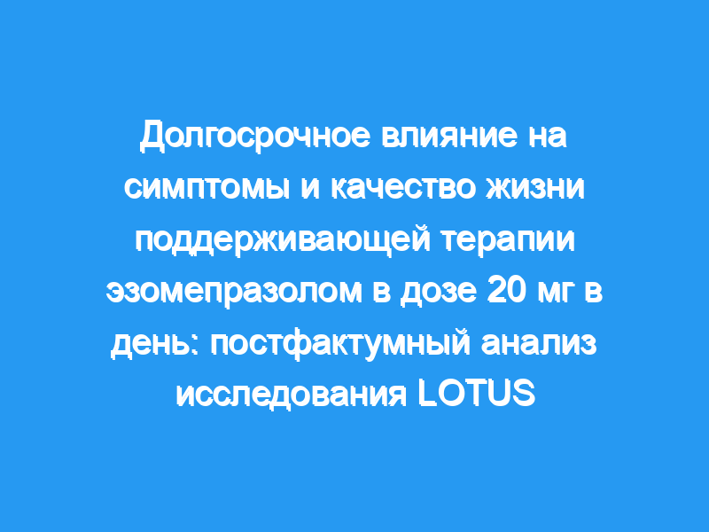 Для оценки долгосрочного влияния на симптомы и качество жизни эзомепразола в дозе 20 мг один раз в день, рекомендуемой для поддерживающей терапии гастроэзофагеальной рефлюксной болезни (ГЭРБ). Дизайн и методы исследования: Это последующий анализ 5-летних данных пациентов, участвовавших в исследовании LOTUS (ClinicalTrials.gov идентификатор: NCT00251927), которые были рандомизированы на эзомепразол в дозе 20 мг один раз в день. У всех участников была хроническая симптоматическая ГЭРБ, реагирующая на лечение. Желудочно-кишечные симптомы оценивались врачами и с помощью инструментов, описывающих результаты, о которых сообщали пациенты. Исследования включали эндоскопию желудочно-кишечного тракта (с взятием биопсии), 24-часовой мониторинг рН пищевода и лабораторные измерения.