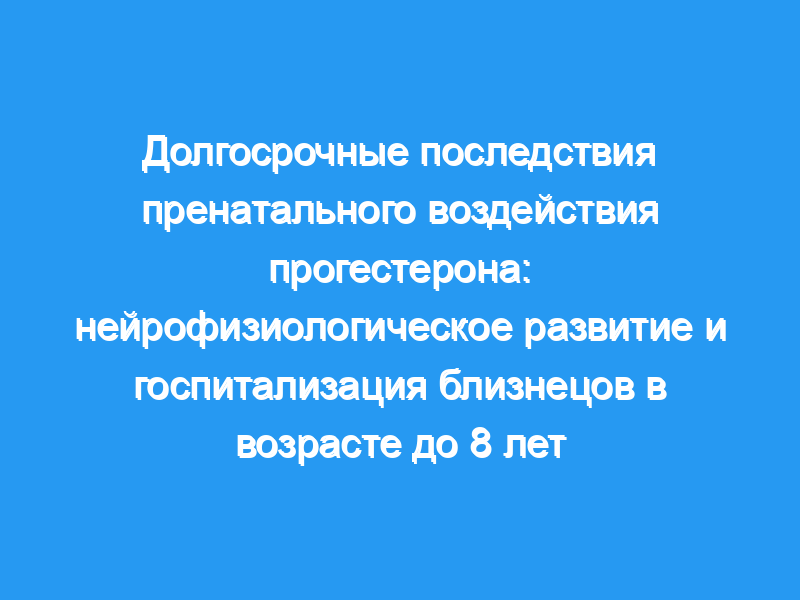 В общей сложности 492 ребенка были подвергнуты пренатальному воздействию прогестерона и 497 — плацебо. Не было никакой разницы в количестве госпитализаций или продолжительности пребывания в больнице между группами лечения, и мы не обнаружили общей разницы в частоте постановки диагнозов. Тем не менее, отношение шансов (ORs) для диагноза, касающегося сердца, составило 1,66 (95% ДИ, 0,81-3,37), в пользу плацебо, среди всех детей, 2,38 (95% ДИ, 1,07-5,30) у дихорионических близнецов и 8,19 (95% ДИ, 1,02-65,6) у всех детей. при исключении диагнозов, поставленных при посещении амбулаторной клиники. Оценки ASQ были доступны для 437 детей (прогестерон, n = 225, плацебо, n = 212). Средний балл ASQ был несколько выше в группе прогестерона по сравнению с группой плацебо (Р = 0,03). У дихорионических близнецов риск низкого балла ASQ (<, 10(й) центиль) был снижен в группе прогестерона (OR, 0,34 (95% ДИ, 0,14-0,86)).