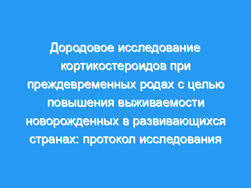 Мы предполагаем, что многострановое, двустороннее, параллельное кластерное рандомизированное контролируемое исследование для оценки того, может ли многостороннее вмешательство увеличить использование дородовых кортикостероидов, включая компоненты для улучшения выявление беременностей с высоким риском преждевременных родов, а также обеспечение и содействие надлежащему применению стероидов позволят снизить неонатальную смертность у недоношенных новорожденных на 28-й день жизни по сравнению со стандартным оказанием медицинской помощи в отдельных группах населения шести стран. 102 кластера в Аргентине, Гватемале, Кении, Индии, Пакистане и Замбии будут рандомизированы, и в них будут включены около 60 000 женщин и новорожденных. Будут розданы наборы, содержащие флаконы с дексаметазоном, шприцы, перчатки и инструкции по применению. Улучшение выявления женщин с высоким риском преждевременных родов будет осуществляться путем (1) распространения рекомендаций по использованию дородовых кортикостероидов среди медицинских работников, (2) обучения медицинских работников выявлению женщин с высоким риском преждевременных родов, (3) предоставления медицинским работникам напоминаний об использовании наборов, и (4) использование цветной ленты для измерения высоты матки для оценки гестационного возраста у женщин с неизвестным гестационным возрастом. Как в группах вмешательства, так и в группах контроля медицинские работники будут обучены основам ухода за новорожденными для детей с низким весом при рождении. Первичным исходом является неонатальная смертность на 28-й день жизни у недоношенных детей.