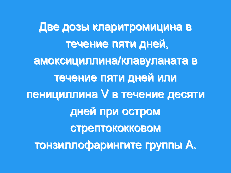 При стрептококковом тонзиллофарингите группы А 5-дневное лечение кларитромицином или амоксициллином/клавуланатом имело клиническую эффективность, сравнимую с 10-дневным лечением пенициллином V, однако амоксициллин/клавуланат и пенициллин V были бактериологически более эффективны, чем кларитромицин, из-за его неспособности уничтожить кларитромицинрезистентные бактерии. Изоляты S. pyogenes. 5-дневные схемы приема кларитромицина не рекомендуются для лечения стрептококкового тонзиллофарингита в районах, где распространена резистентность стрептококков группы А к кларитромицину in vitro.