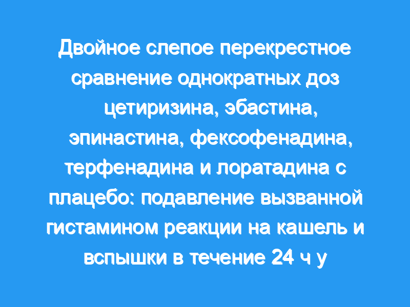 Эпинастин подавлял рост и вспышку через 30 минут. Цетиризин начал действовать через 1 час и превосходил другие методы лечения. Эбастин был не лучше плацебо до 4 ч, но после этого был эффективен до 24 ч. Терфенадин вызывал мощное ингибирование через 1 ч и превосходил его метаболит фексофенадин. Лоратадин был наименее мощным ингибитором. Ингибирование реакции вспышки соответствовало паттернам, наблюдаемым для wheals. Порядок ранжирования площади под кривой (0-24 ч) был следующим: цетиризин, эпинастин, терфенадин, эбастин, фексофенадин, лоратадин и плацебо.