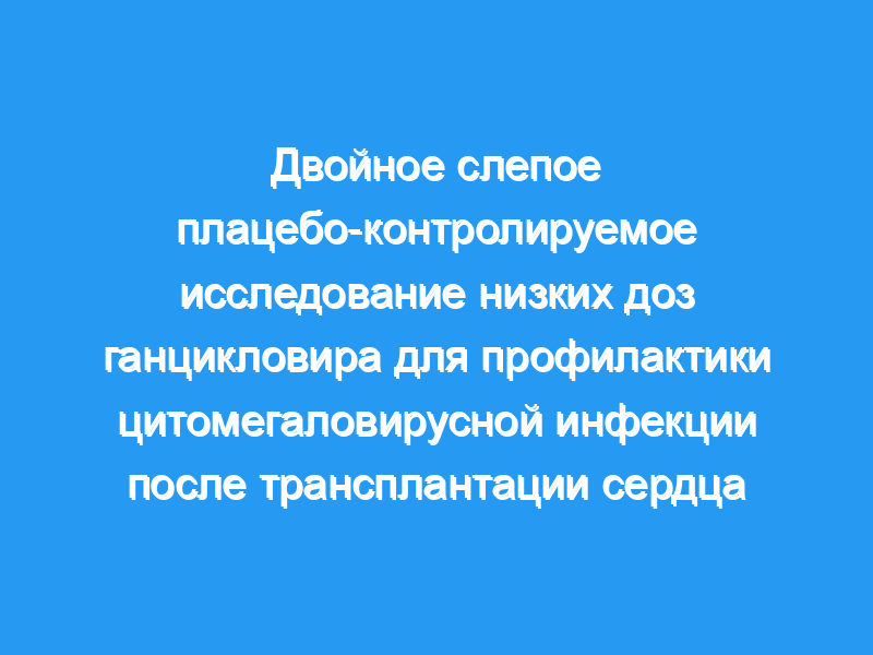 Целью этого двойного слепого плацебо-контролируемого исследования было определить, предотвращает ли длительный курс низких доз ганцикловира развитие клинической цитомегаловирусной болезни после трансплантации сердца. Пятьдесят шесть последовательных пациентов были разделены на две группы: цитомегаловирус-положительные реципиенты (n = 40) и цитомегаловирус-отрицательные реципиенты органов от цитомегаловирус-положительных доноров (n = 16). Все пациенты получали индукцию лошадиного антитимоцитарного глобулина в течение 7 дней и поддерживающие дозы циклоспорина, азатиоприна и преднизолона. Ганцикловир (5 мг/кг внутривенно) или соответствующее плацебо вводили с премедикацией три раза в неделю в течение первых 6 недель после трансплантации и еще в течение 2 недель при каждом эпизоде отторжения в период от 6 до 12 недель.