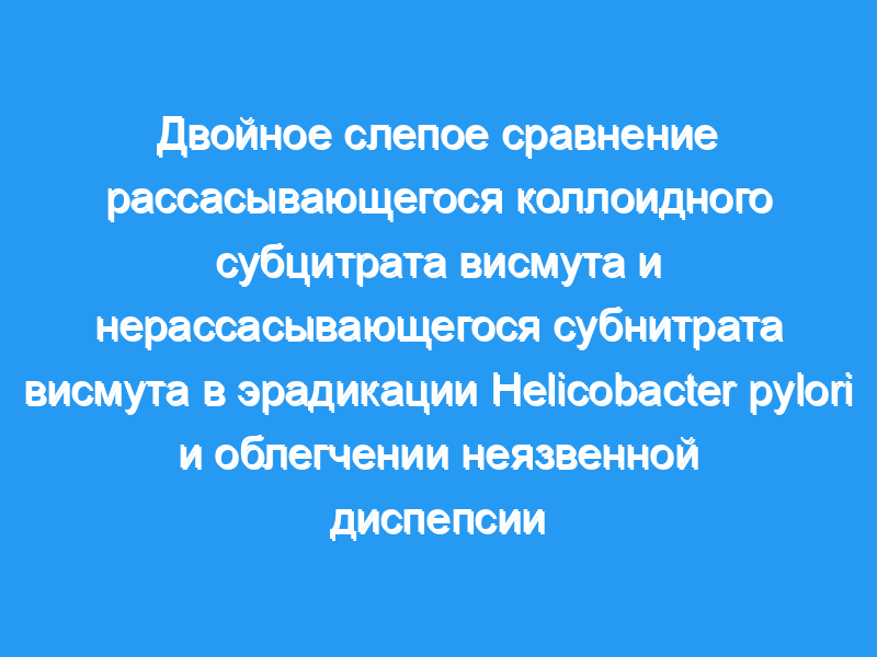 Было проведено двойное слепое рандомизированное плацебо-контролируемое исследование с участием 120 H. pylori-позитивных пациентов с неязвенной диспепсией. Группа CBS + Ab (n = 35) получала коллоидный субцитрат висмута (одна таблетка qds), амоксициллин (500 мг qds) и метронидазол (400 мг tds). Группа BSN+ Ab (n = 35) получала субнитрат висмута (две таблетки tds) и те же антибиотики. Группа Ab (n = 35) получала плацебо с висмутом (две таблетки tds) и антибиотики. Группа BSN (n = 15) получала субнитрат висмута (две таблетки tds) и антибиотики плацебо. Висмут принимали в течение 4 недель, а антибиотики — в течение первых 2 недель. Оценивали эрадикацию H. pylori, побочные эффекты, комплаентность, оценку симптомов до и после лечения и абсорбцию висмута.