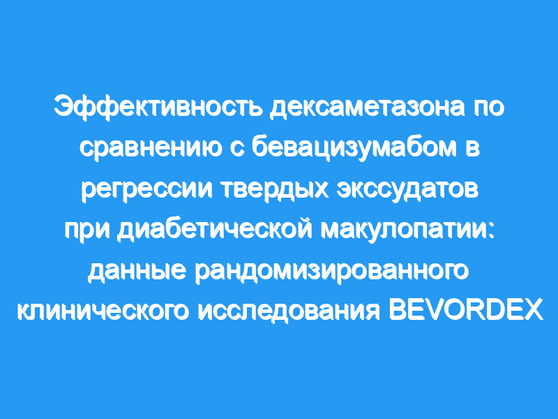 Сообщить о влиянии бевацизумаба по сравнению с дексаметазоном на твердый экссудат (HEX) при диабетическом макулярном отеке (DME). Дизайн: Последующий анализ 24-месячных данных рандомизированного клинического исследования бевацизумаба ИЛИ ДЕКсаметазона при диабетическом макулярном отеке (БЕВОРДЕКС), фаза 2 многоцентрового рандомизированного клинического исследования. В исследование были включены глаза с ДМЭ с вовлечением центра, устойчивые к макулярной лазерной терапии или вряд ли получившие пользу от нее. Глаза были рандомизированы на бевацизумаб каждые 4 недели или имплантат дексаметазона Ozurdex (DEX) каждые 16 недель, оба по мере необходимости. Были проанализированы 68 глаз 48 пациентов, завершивших 24-месячное наблюдение. Два оценщика в масках оценили степень и местоположение HEX на базовых, 12-месячных и 24-месячных цветных фотографиях глазного дна с центром в ямке, используя проверенное программное обеспечение для оценки.