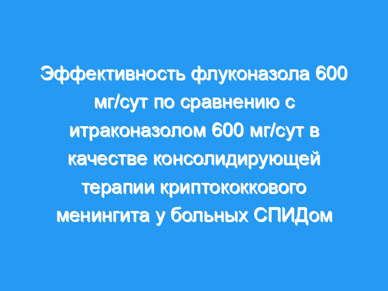 Целью данного исследования была оценка эффективности пероральных флуконазола и итраконазола в дозе, превышающей рекомендуемую, в качестве консолидирующей терапии криптококкового менингита у больных СПИДом. Дизайн и метод: В это исследование были включены ВИЧ-инфицированные пациенты с первичным криптококковым менингитом, которых первоначально лечили амфотерицином В в течение 2 недель. Они были рандомизированы на две группы, которые получали либо флуконазол в дозе 600 мг ежедневно, либо итраконазол в дозе 600 мг ежедневно в течение 10 недель. Клинически было определено, что реакция на два различных метода лечения была успешной, если после 10 недель лечения не оставалось никаких клинических симптомов и признаков менингита, а грибковая культура спинномозговой жидкости (ликвора) была отрицательной.