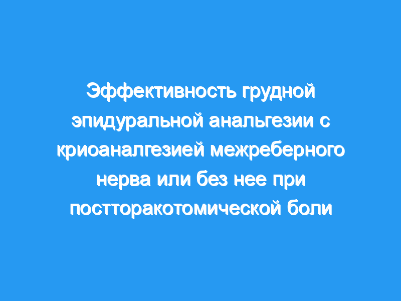 Мы оценили влияние эпидуральной анальгезии грудной клетки в сочетании с криоаналгезией межреберных нервов или только эпидуральной анальгезией на острую и длительную боль после заднебоковой торакотомии. Сорок два пациента с плановой торакотомией были случайным образом распределены на две группы: эпидуральная анестезия в сочетании с криоаналгезией или только эпидуральная анестезия. Перед введением анестезии был введен грудной эпидуральный катетер. В конце операции была проведена криоаналгезия 3 межреберных нервов: 1 на уровне разреза, 1 каудальный и 1 краниальный. Криоаналгезия была закрыта для исследующих анестезиологов и пациентов. Чтобы избежать ущемления межреберных нервов, закрытие грудной клетки у всех пациентов было выполнено с использованием внутриреберных швов через просверленные отверстия в соседних ребрах. В отделении постанестезического ухода была начата эпидуральная инфузия ропивакаина (1 мг/мл) с фентанилом (5 мкг/мл) и продолжалась 3 дня. После этого боль лечили пероральными сильными или слабыми опиоидами в сочетании с нестероидными противовоспалительными препаратами или ацетаминофеном. Боль оценивалась с помощью вербальной шкалы боли или визуальной аналоговой шкалы. Пациенты посещали местную клинику боли через 8 недель и через 6 месяцев после операции.