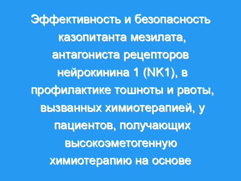 Исследование проводилось в период с 6 ноября 2006 года по 9 октября 2007 года в 77 участвующих центрах в 22 странах. Все 810 пациентов, включенных в исследование, получали дексаметазон и ондансетрон. Пациенты были рандомизированы для получения плацебо (n=269), однократной пероральной дозы казопитанта мезилата (150 мг перорально, n=271) или 3-дневного внутривенного введения плюс пероральный прием казопитанта мезилата (90 мг внутривенно в 1-й день плюс 50 мг перорально во 2-й и 3-й дни, n=270).. Рандомизация проводилась с использованием центральной телефонной системы на уровне исследования, поскольку ожидалось, что некоторые центры наберут всего несколько пациентов в течение периода исследования. Первичной конечной точкой была доля пациентов, достигших полного ответа (отсутствие рвоты, позывов на рвоту или использования спасательных препаратов) в течение первых 120 ч после приема ГЭК. Анализ эффективности был проведен на модифицированной популяции с намерением лечить (n=800), которая включала всех пациентов, получавших плацебо или исследуемый препарат и ГЭК (n=265 контрольных, n=266 однократных пероральных доз казопитанта мезилата, n=269 3-дневных внутривенных и пероральных казопитанта мезилата). Безопасность была отмечена у 802 пациентов, которые получали либо плацебо, либо исследуемый препарат. Это исследование зарегистрировано в ClinicalTrials.gov , NCT00431236. Результаты: Значительно больше пациентов в каждой группе казопитанта достигли полного ответа в 1-м цикле лечения ГЭК, чем в контрольной группе (175 [66%] пациентов в контрольной группе, 228 [86%] в группе перорального приема мезилата казопитанта в однократной дозе [p<,0,0001 по сравнению с контролем], и 214 [80%] в 3-дневной группе внутривенного введения плюс пероральный мезилат казопитанта (р=0,0004 по сравнению с контролем]). Это улучшение сохранялось в течение нескольких циклов HEC. Нежелательные явления произошли у 205 (77%) пациентов в группе перорального приема казопитанта мезилата в однократной дозе и у 203 (75%) пациентов в группе 3-дневного внутривенного и перорального приема казопитанта мезилата по сравнению с 194 (73%) пациентами в контрольной группе. Наиболее частыми серьезными нежелательными явлениями были нейтропения (n=5 [3%] в контрольной группе, n=3 [1%] в группе перорального приема казопитанта мезилата в однократной дозе и n=11 [4%] в группе 3-дневного внутривенного введения плюс пероральный прием казопитанта мезилата), лихорадка. нейтропения (n=1 [<,1%] в контрольной группе, n=4 [1%] в группе перорального приема казопитанта мезилата в однократной дозе и n=6 [2%] в 3-дневной группе внутривенного введения плюс пероральный прием казопитанта мезилата) и обезвоживание (n=4 [2%] в контрольной группе, n=2 [<1%] в группе перорального приема казопитанта мезилата в однократной дозе и n=1 [<1%] в 3-дневной группе внутривенного введения плюс пероральный прием казопитанта мезилата). Интерпретация: Схема приема трех препаратов, включающая однократную пероральную дозу или 3-дневное внутривенное введение плюс пероральный режим приема казопитанта мезилата плюс дексаметазон и ондансетрон, значительно снижала частоту случаев CINV у пациентов, получавших HEC, по сравнению с режимом приема двух препаратов дексаметазона и ондансетрона. Финансирование: GlaxoSmithKline.