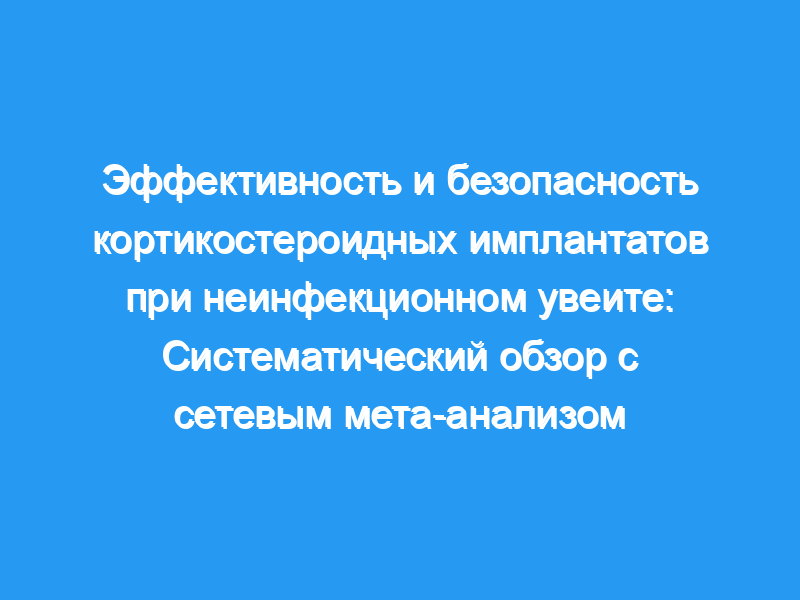 В этот систематический обзор были включены восемь РКИ, из которых три статьи из двух исследований (n = 358 пациентов) были включены в сетевой мета-анализ. Имплантация дексаметазона в дозе 0,70 мг (через 1,5 месяца) была связана с лучшими результатами, чем имплантация ацетонида флуоцинолона в дозе 0,18 мг (через 1 месяц), в улучшении степени помутнения стекловидного тела (ОР = 2,96, 95% ДИ = 1,23-7,07), и с меньшим развитием катаракты в 12 лет (ОР = 0,36, 95%ДИ = 0,17, 0,79) и 36 месяцев (ОР = 0,37, 95%ДИ = 0,20, 0,71).