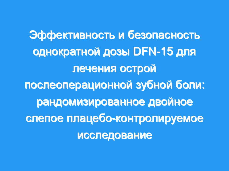 В этом рандомизированном двойном слепом плацебо-контролируемом исследовании с диапазоном доз 120 здоровых взрослых людей, перенесших удаление третьих коренных зубов нижней челюсти с двусторонним поражением и испытавших умеренную или сильную боль после операции, были распределены случайным образом в соотношении 1:1:1:1, чтобы получить одну дозу либо плацебо, либо DFN-15 в 3 дозах: 62,5, 125 и 250 мг.