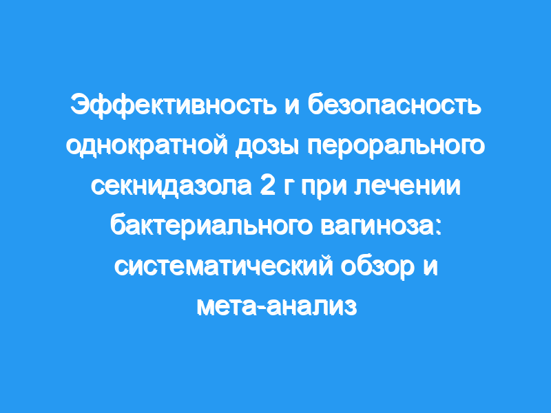 Оценить данные опубликованных рандомизированных клинических исследований (РКИ) об эффективности и безопасности однократной дозы перорального секнидазола 2 г по сравнению с другими препаратами. Стратегия поиска: Поиск в электронных базах данных проводился с использованием следующих терминов MeSH (бактериальный вагиноз ИЛИ вагиноз) И (secnidazole ИЛИ secnol ИЛИ sabima ИЛИ secnidal ИЛИ minovage). Критерии отбора: Для этого мета-анализа были рассмотрены все РКИ, оценивающие эффект секнидазола при лечении БВ. Было выявлено двести тридцать два исследования, из которых шесть исследований были признаны подходящими для данного обзора. Сбор и анализ данных: Извлеченные данные были введены в программное обеспечение RevMan. Были рассчитаны относительный риск (ОР) и 95% доверительный интервал (ДИ). Извлеченными результатами были клиническое излечение и побочные эффекты.