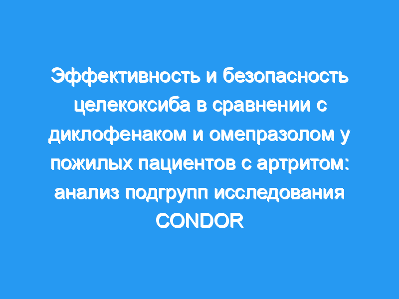 Сравнить безопасность и эффективность целекоксиба по сравнению с диклофенаком медленного высвобождения (SR) плюс омепразол у пожилых пациентов с артритом. План и методы исследования: Пациенты в возрасте ≥65 лет, с остеоартритом и/или ревматоидным артритом, с высоким желудочно-кишечным (желудочно-кишечным) риском, которые участвовали в исследовании CONDOR (Целекоксиб против Омепразол и диклофенак у пациентов с остеоартритом и ревматоидным артритом) были включены в этот субанализ. CONDOR представлял собой 6-месячное проспективное двойное слепое рандомизированное многоцентровое международное исследование с параллельными группами, в котором сравнивалось лечение целекоксибом в дозе 200 мг два раза в день (BID) по сравнению с диклофенаком SR в дозе 75 мг BID плюс омепразол в дозе 20 мг в день. Основные итоговые показатели: Первичной конечной точкой была совокупность клинически значимых событий в верхних и нижних отделах желудочно-кишечного тракта, оцененных независимой слепой экспертной комиссией. Эффективность определялась Общей оценкой артрита у пациента.