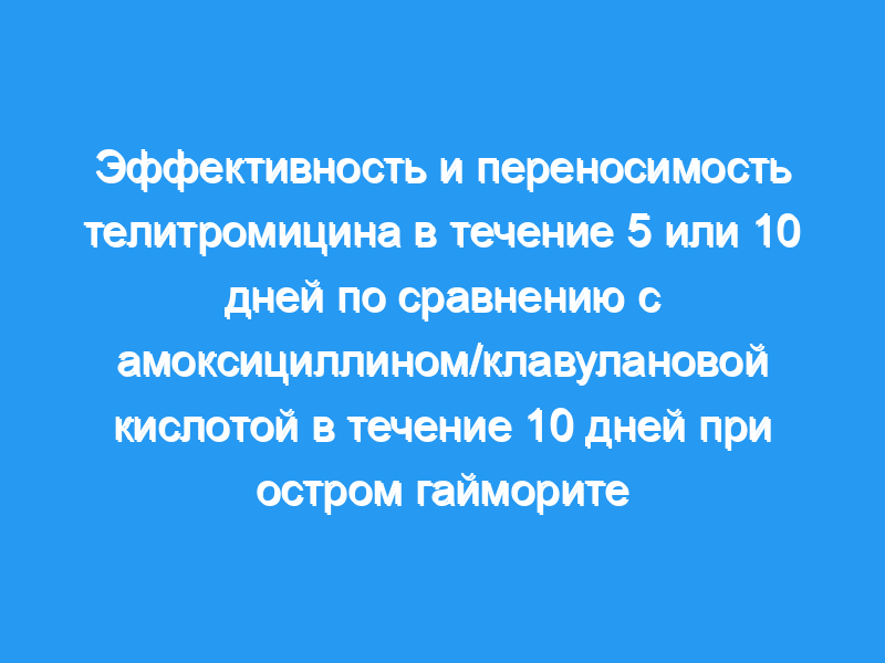Мы пришли к выводу, что 5 или 10 дней приема телитромицина в дозе 800 мг один раз в день так же эффективны клинически и так же хорошо переносятся, как и 10 дней лечения амоксициллином/клавулановой кислотой.