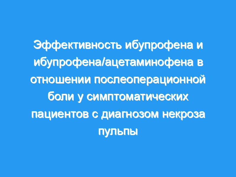 Целью этого проспективного рандомизированного двойного слепого исследования было определить эффективность ибупрофена в сравнении с ибупрофеном/ацетаминофеном при послеоперационной эндодонтической боли у симптоматических пациентов с диагнозом некроза пульпы и связанной с этим периапикальной лучевой недостаточностью, которые испытывали умеренную или сильную предоперационную боль. Мы также зафиксировали использование лекарств для побега. В этом исследовании принял участие семьдесят один взрослый пациент, обратившийся за экстренным эндодонтическим лечением с симптоматическим верхнечелюстным или нижнечелюстным зубом с диагнозом некроза пульпы, периапикальной рентгенопрозрачной области и умеренной или сильной боли. Пациенты были случайным образом разделены на 2 группы путем случайного распределения и числового кодирования. Экстренная обработка зуба была завершена с помощью ручного и ротационного инструментария. В конце приема пациенты случайным образом получали капсулы либо 600 мг ибупрофена, либо 600 мг ибупрофена в сочетании с 1000 мг ацетаминофена (слепо как для оператора, так и для пациента). Пациенты также получали 6-дневный дневник, который нужно было заполнять после окончания анестезии и каждое утро в течение 5 дней. Пациентов просили записывать боль, симптомы и количество принятых капсул. Пациенты получали спасительное лекарство (Викодин), если исследуемое лекарство не контролировало их боль. Послеоперационные данные анализировали с помощью рандомизационного теста и понижающего метода Бонферрони Холма. Результаты и выводы: Наблюдалось снижение уровня боли и использования анальгетиков с течением времени в группах ибупрофена и ибупрофена/ацетаминофена. Не было статистически значимой разницы между 2 группами в отношении применения анальгетиков или избегания приема лекарств. Примерно 20% пациентов в обеих группах нуждались в медикаментозном лечении для контроля боли.