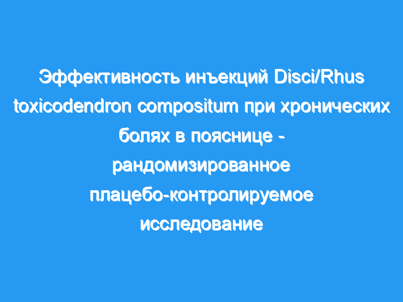 Эффективность инъекционной терапии при болях в пояснице до сих пор остается спорной. Мы сравнили эффективность местных инъекций гомеопатического препарата Disci/Rhus toxicodendron compositum (verum) с инъекциями плацебо и без лечения у пациентов с хронической болью в пояснице. Методология/основные результаты: В рандомизированном контролируемом частично двойном слепом многоцентровом исследовании пациенты с хронической болью в пояснице из 9 немецких амбулаторных клиник были включены и случайным образом распределены в соотношении 1:1:1 для получения подкожных инъекций (verum или плацебо) в болезненные участки нижней части спины в течение 12 сеансов лечения в течение восьми недель или вообще без лечения (спасательные обезболивающие с парацетамолом или НПВП). Весь персонал и участники исследования были замаскированы для распределения лечения. Основным показателем результата была средняя интенсивность боли за последние семь дней по визуальной аналоговой шкале (0-100 мм, 0 = отсутствие боли, 100 = самая сильная мыслимая боль) через восемь недель. Период наблюдения составил 26 недель. Первичный анализ проводился по намерению лечить. В период с августа 2007 по июнь 2008 года 150 пациентов были случайным образом распределены на три группы (51 верум, 48 плацебо и 51 без лечения). Средняя интенсивность боли в пояснице с поправкой на исходный уровень на восьмой неделе составила: группа verum 37,0 мм (97,5% ДИ 25,3,48,8), группа без лечения 53,0 (41,8,64,2) и группа плацебо 41,8 (30,1,53,6). Верум значительно превосходил отсутствие лечения (Р = 0,001), но не плацебо (Р = 0,350). О каких-либо существенных побочных эффектах не сообщалось. Выводы/значимость: Гомеопатический препарат не превосходил плацебо. По сравнению с отсутствием лечения инъекции привели к значительному и клинически значимому облегчению хронической боли в спине. Пробная регистрация: ClinicalTrials.gov NCT00567736.