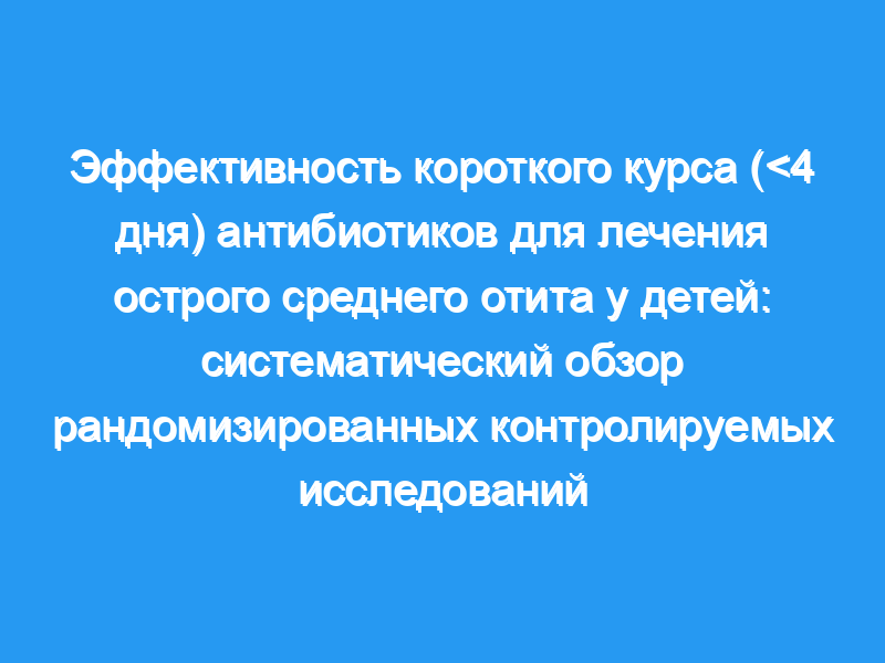 Определить эффективность короткого курса антибиотиков (<4 дня) по сравнению с более длительным курсом (>4 дня) для лечения острого среднего отита у детей. Источники данных: Электронные базы данных, ручной поиск обзоров, библиографий книг, тезисов и материалов международных конференций. Методы обзора: Были включены рандомизированные контролируемые исследования эмпирического лечения острого среднего отита, в которых сравнивались режимы приема антибиотиков <,4 дня против >, 4 дня у детей в возрасте от четырех недель до восемнадцати лет. Испытания были сгруппированы по фармакокинетическому поведению антибиотиков короткого курса на антибиотики короткого действия, парентеральный цефтриаксон и азитромицин длительного действия.