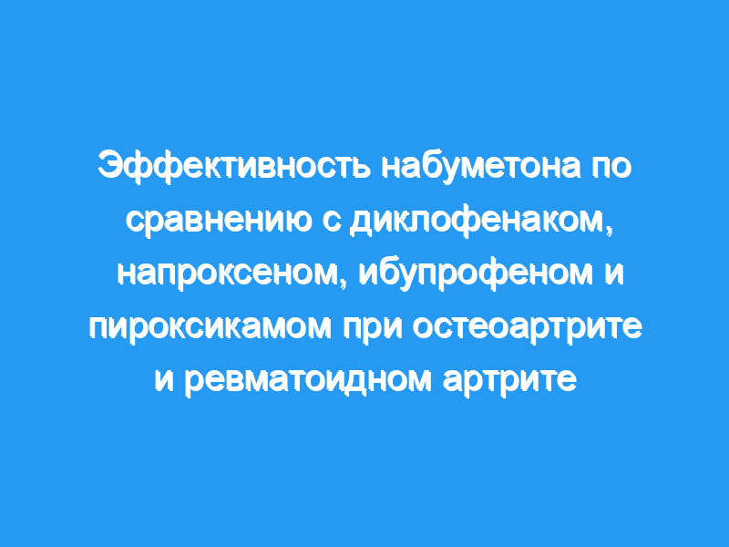 Кроме того, меньшее количество пациентов с РА, получавших набуметон (8,8%), отказались от лечения из-за недостаточной эффективности, чем те, кто получал диклофенак (10,3%), напроксен (11%), пироксикам (13,5%) или ибупрофен (13,2%). В заключение, в крупном рандомизированном открытом исследовании, имитирующем реальную терапию, набуметон оказался таким же эффективным, как диклофенак, напроксен, пироксикам и ибупрофен для лечения пациентов с ОА. Однако при РА набуметон был значительно более эффективен, чем НПВП-аналоги, и меньшее количество пациентов было отменено из-за недостаточной эффективности.